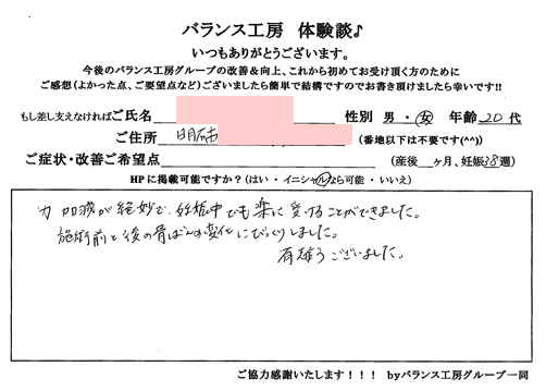 昨日はとっても長い時間丁寧に施術いただきありがとうございました。 母と二人で、先生が帰られたあとも「よかったね〜、すごいね〜」などと 盛り上がっておりました。 大満足だったので、感動を忘れないうちにメールさせていただきます。 妊娠後期に切迫早産で入院になり、その原因が骨盤の緩みからきていると知り、産後は絶対に骨盤矯正をしなくては!と思っていました。 産後は自分でも違和感を感じるほど、骨盤がグラグラし動くたびにギシギシいっているような感じでした。 産後1週間ほどから恥骨と尾骨に痛みが走り、お通じのたびに骨が開いていくような感覚に悩まされました。 いくつも骨盤矯正のお店のサイトを見ましたが、一番効果がありそう!と 直感したバランス工房さんにお願いすることに。 決め手は患者からの視点に基づいたHPづくりでした。不安なことがすべて 説明されていて信頼できると感じたのです。 施術はとても丁寧で、力加減を確認してくれますし、「痛いのを我慢しないように」 と仰り終始気持ちいい加減でマッサージしていただきました。 強く押したわけではないのに、みるみる肩や首のコリがほぐれたのは驚きです。 目的の骨盤矯正は恥骨、尾骨の痛みを解消したあとにしていただきましたが、骨がスーッと中に入っていく感じが体感できました。 施術前とはあきらかにベルトの締まる位置が変わっていたのですが 産後お尻から腰にかけて入らなかったウールのパンツ(伸縮性なし)が閉まるようになったのでさらに感動しました! 教わった体操を続けて、これからもっと骨盤を締めていきたいと思います。 次回もよろしくお願いします。 山田 ●●● |