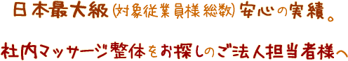 3ヶ月以上かけて会社内へのマッサージサービス導入を慎重に検討された、だれもがご存知の世界的企業様のご担当者複数が、技術力・サービス力・緊急時の対応、費用など総合評価をした上で、我々のサービスを絶賛して2年以上継続されています。何よりお喜びいただけている証拠ではないでしょうか?