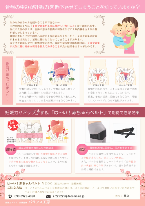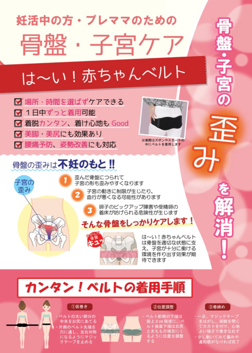 元々、美脚になりヒップアップ(美尻)、 骨盤の歪みやO脚をよくするために開発された「美人ベルト」が 不妊症対策に役に立つのでは?というお声から、不妊症の方にも広まり「は〜い!赤ちゃんベルト」となったのが経緯です。
