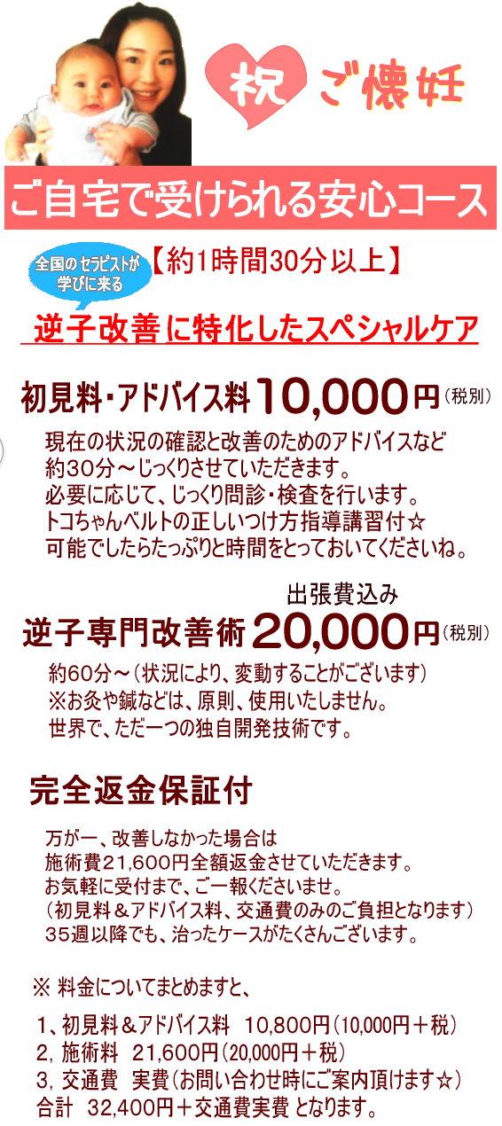 万が一、逆子ちゃんが改善しなかった場合は施術費21,600円全額返金させていただきます。お気軽に受付まで、ご一報くださいませ。(初見料&アドバイス料、交通費のみのご負担となります)