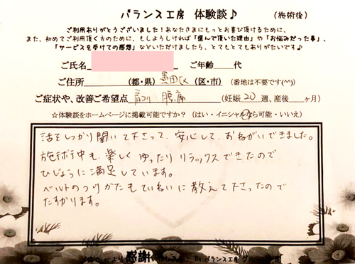 産前も、妊娠中も、ちょっと腰が痛いのでお願いしたのですが、産後今3週間なんですけれども、ちょっと骨盤を(の)矯正をしてもらいました。
