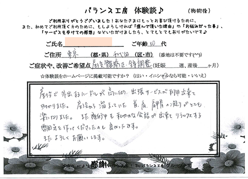 普段のが疲れがでてくるので、どうしてもそのあたりはよくならないというのがあるんですけれども、それが、やっていただいてバランス工房さんでの施術が非常に痛みもなくて、で、またすごく気持ちいいんですね。