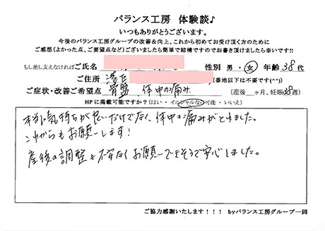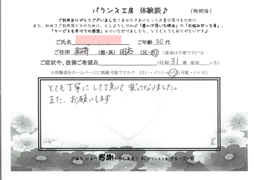 おかげさまで腰痛も良くなって骨盤矯正も一緒にやってもらって、 妊娠前のズボンが全部入るようになりました。 ありがとうございます。