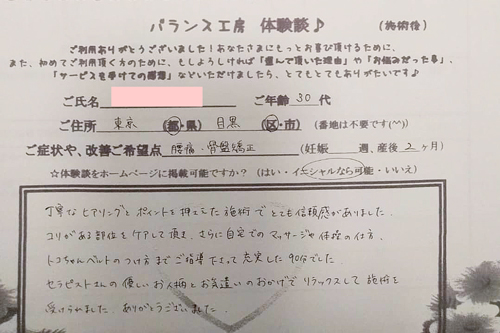 凝りがある部位をケアして頂き、さらに自宅でのマッサージや体操の仕方、トコちゃんベルトのつけ方までご指導くださって充実した90分でした。