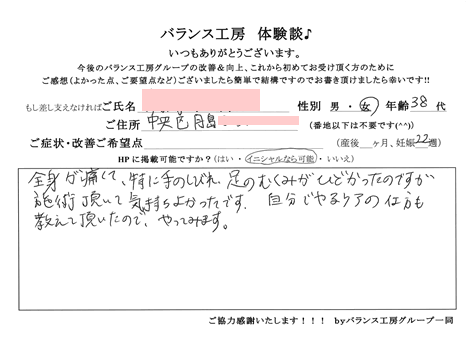 妊娠22週 手のしびれ 全身のむくみ マタニティ整体 妊婦整体 東京都 中央区 口コミ 評判