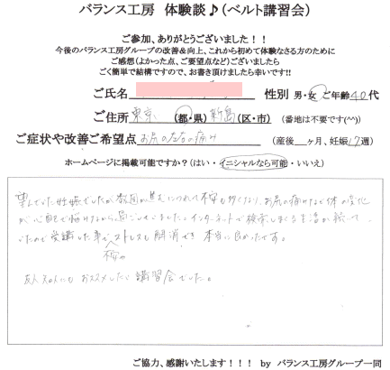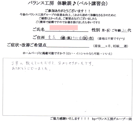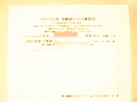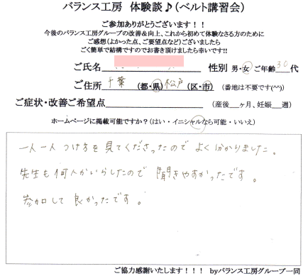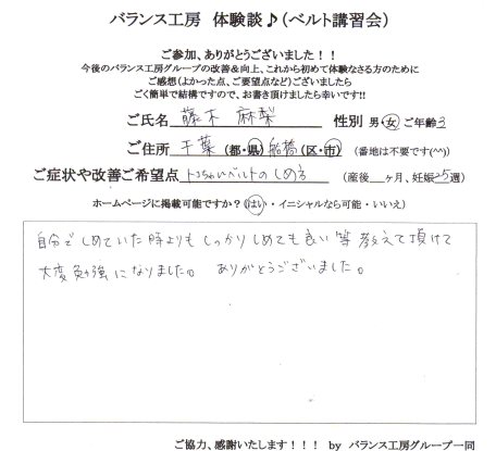 トコちゃんベルトの付け方が全くわからず、困っていましたが、本日参加したことで、正しい位置、つけ方がわかり、腰痛、姿勢の改善ができたと思います。