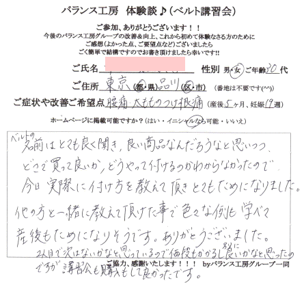 楽しいおしゃべりで分かりやすくベルトの装着方法を教えて頂いてありがとうございました。骨盤をキュッとすると気持ちいいという感覚が体験できました。